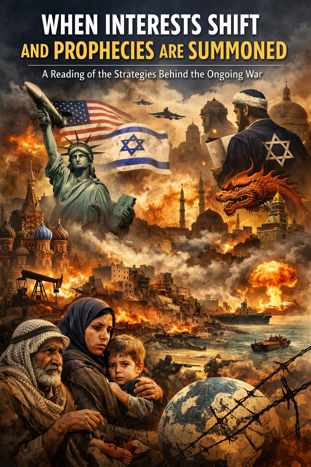 This is why the ongoing war is not simply a confrontation between states and armies. It is a war of interests that rearrange themselves whenever balances of power shift; a war of symbols in which God is invoked, books of prophecy reopened, and geography itself is given an apocalyptic meaning that exceeds its physical boundaries. Once interest joins hands with prophecy, once strategy fuses with narrative, and once domination cloaks itself in sacred promise, the conflict becomes far larger than a passing military clash. It becomes a whole architecture of justification, mobilisation, and entrapment, into which peoples are driven — at one moment in the name of security, at another in the name of history, at another in the name of revelation, and at yet another in the name of salvation itself.[4]